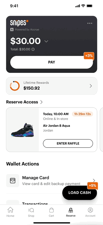 Reserve Access grants wallet members entry to limited sneaker releases that can only be purchased using stored balance and rewards. This created a consistent reason to load funds ahead of time and return to the app regularly. By tying exclusivity to wallet value, the experience shifted from transactional checkout to ongoing participation.