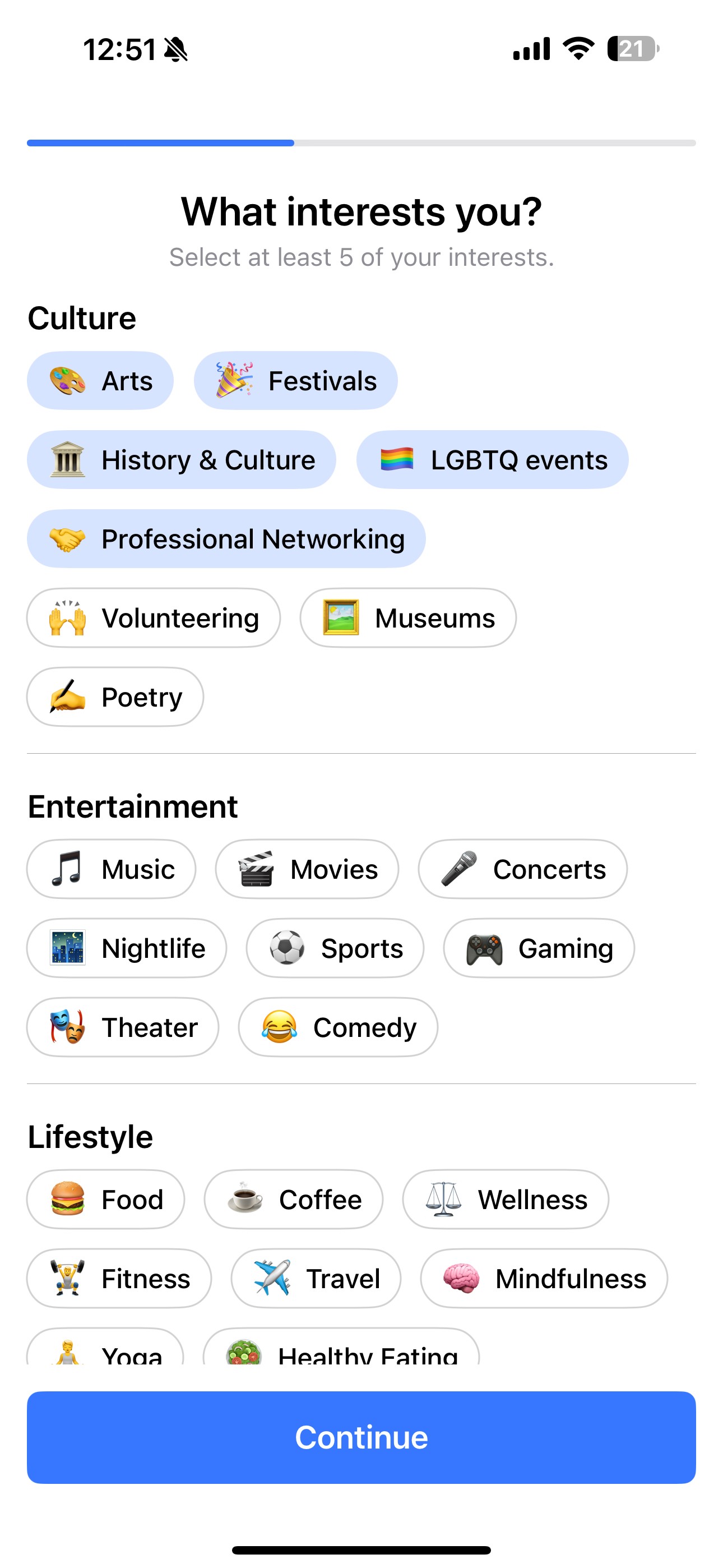 During onboarding, users select their interests, allowing SocialClub to curate events and groups tailored to them.