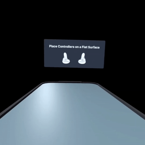 Players begin by calibrating the virtual table to match a physical surface. Using the Tabletop Arcade interface, they follow on-screen instructions to position their VR controllers upside down on the edges of the table. The system uses the midpoint and orientation of the controllers to align the virtual table accurately.
