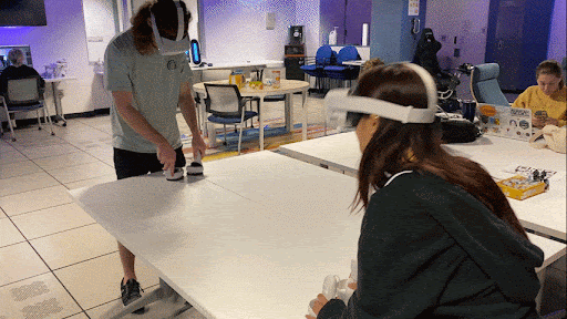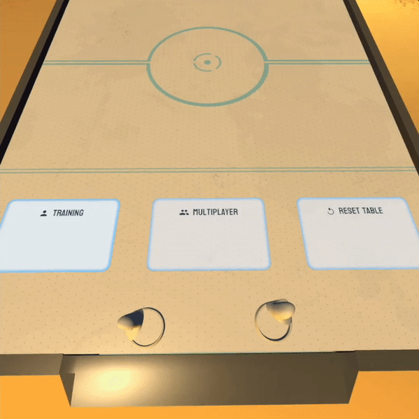 Built in Unity for Oculus Quest, the game featured a virtual air hockey table synced with a physical surface, allowing players to interact naturally. We enhanced realism with 3D-printed controller attachments and haptic feedback to simulate striking and puck interactions. The multiplayer setup enabled real-time matches with synchronized virtual environments, creating an experience reminiscent of real-world air hockey.
